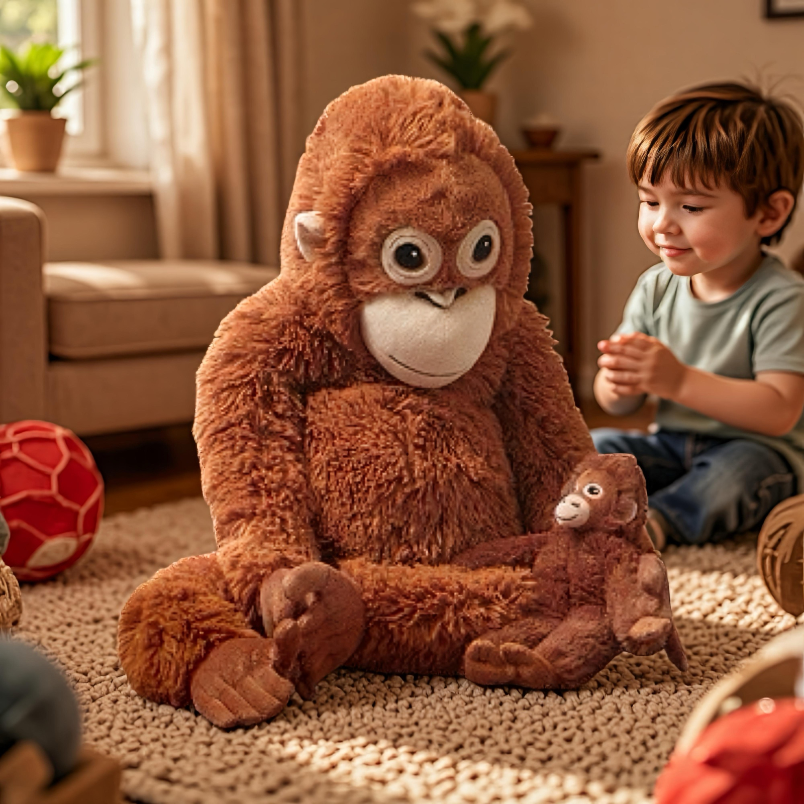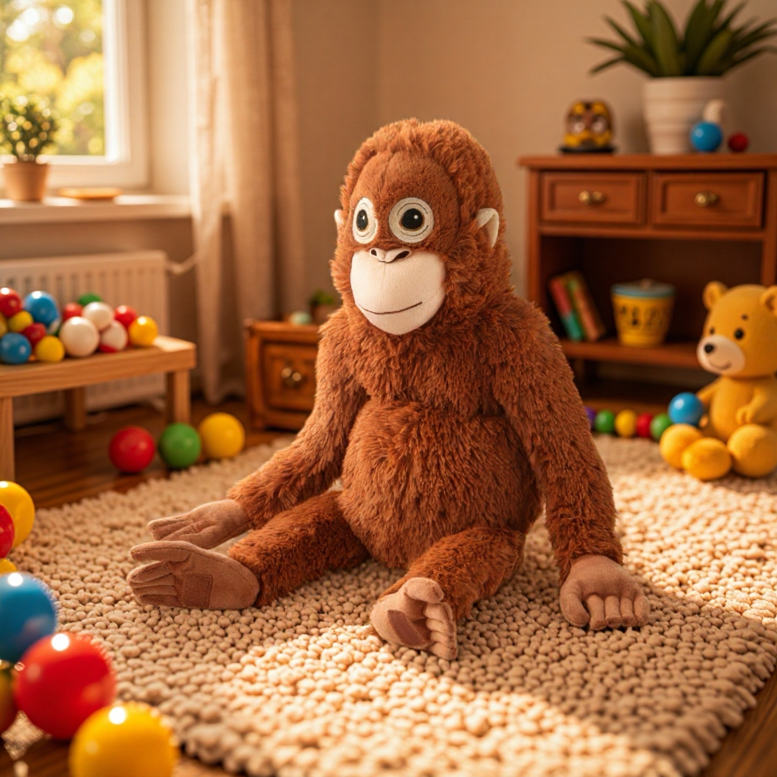 Cu o blană moale și pufoasă, ochi mari expresivi și detalii atent realizate, maimuța este perfectă pentru îmbrățișări, joacă sau momente liniștite înainte de somn. Dimensiunea generoasă o face ideală atât pentru copii, cât și pentru adulții care apreciază jucăriile cu poveste și impact emoțional.